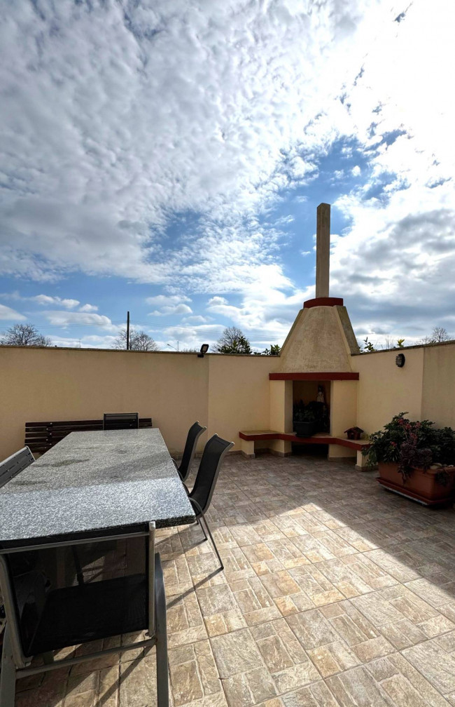 L'immobile si estende su una superficie di ben 120 mq ed ha accesso da veranda privata; si compone di ingresso spazioso, salone luminoso, cucina abitabile con dispensa e accesso diretto a una splendida veranda di ben 55 mq con zona barbecue; disimpegno, tre camere da letto di cui una con predisposizione per bagno en suite, bagno ampio e spazioso.